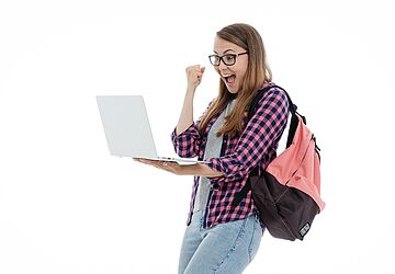 Mädchen mit Brille beißt auf einen Stift und sitzt vor einem Laptop